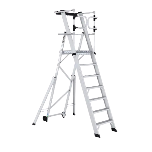 Gazelle Porte Saloon avec plateforme de travail et portillons sécurisés. Disponible de 3 à 9 marches + plateforme. Hauteur de travail jusqu’à 4,5 m.