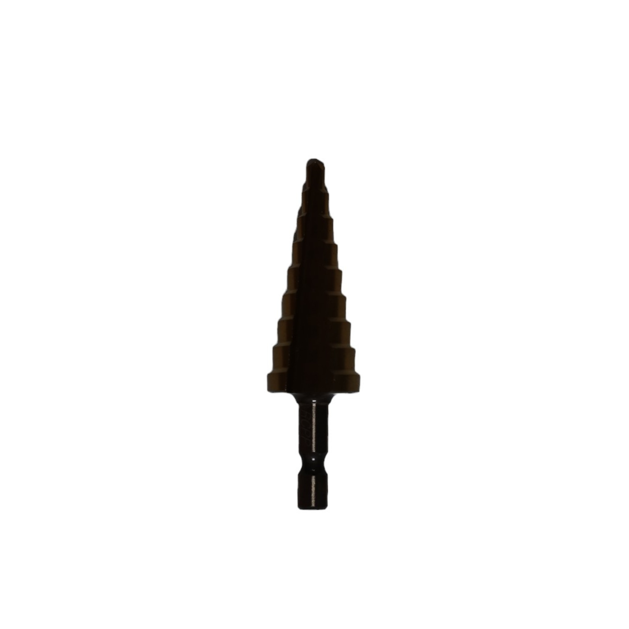 Mèche étagée en acier HSS avec revêtement titane pour perçage net et progressif dans métal, bois, PVC, aluminium. 13 diamètres de 5 à 35 mm.